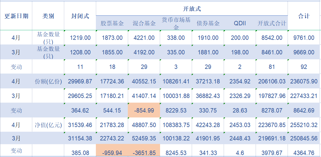混合型基金在4月份遭遇份额和净值双双下降。相比3月份,混合型基金份额减少了854.99亿份,规模也相应减少了3651.85亿元。