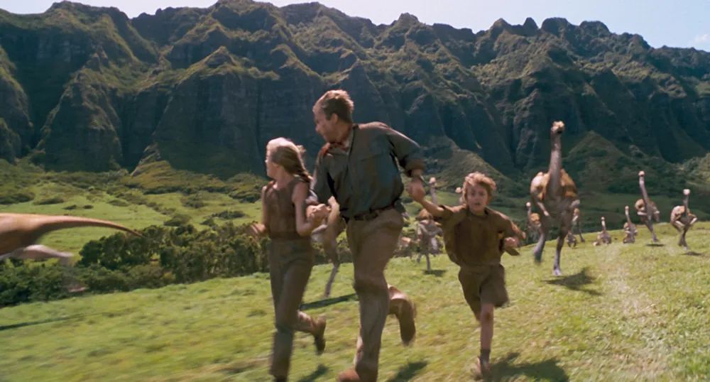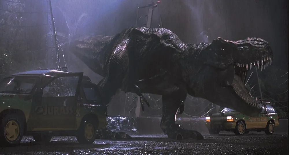 在当时,模型拍摄仍然是电影特效的主流选择,《侏罗纪公园》中的大量场面也仍然是由恐龙机器模型来打造的,但工业光魔公司带来的多个著名电脑特效镜头仍然深深地改变了行业——令人印象深刻的第一幕腕龙全景镜头、暴龙在雨夜袭击汽车的全景镜头、暴龙追逐吉普车、狂奔的似鸵龙群……