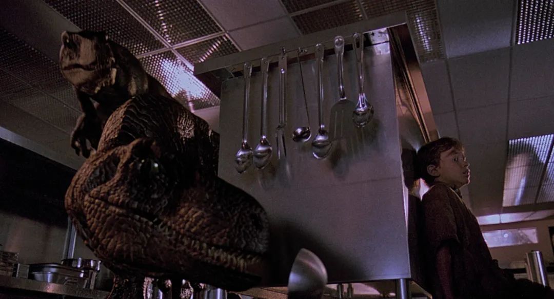 但不得不说,这种复刻的行为也抓住了除恐龙特效之外、22年前那部开山作得以成功的许多电影细节,比如多位人类角色鲜明的人物弧光:恐惧生育的山姆·尼尔、把混沌理论挂在嘴边的杰夫·高布伦、强有力的女性形象劳拉·邓恩;比如重在挖掘恐龙拥有部分智慧后的可怕猎手形象;以及厨房戏中那种惊悚片气氛的营造,用电影技法弥补特效表现力的不足。