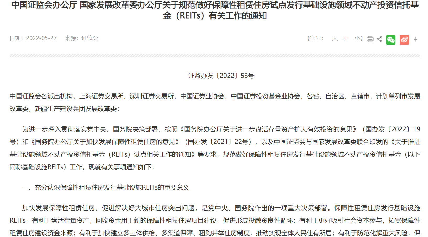 昨日晚间,证监会和发改委联合发布《关于规范做好保障性租赁住房试点发行基础设施领域不动产投资信托基金(REITs)有关工作的通知》(下称《通知》),从四方面推动保障性租赁住房(下称“保租房”)REITs业务规范有序开展。