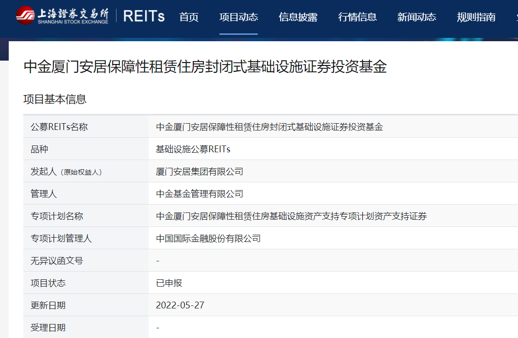 这意味着去年6月份正式起航的公募REITs即将再次迎来扩容。 5月27日,中金厦门安居保障性租赁住房REIT、红土创新深圳人才安居保障性租赁住房REIT分别向上交所、深交所提交了申报资料。