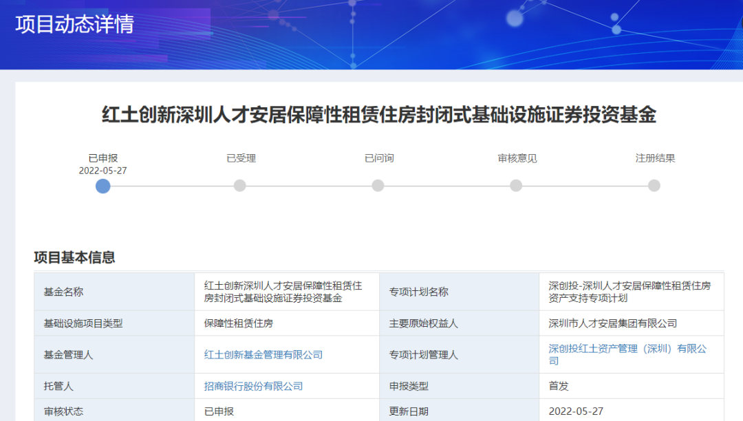 红土创新深圳人才安居保障性租赁住房封闭式REIT的申报资料显示,主要原始权益人为深圳市人才安居集团有限公司,专项计划管理人为深创投红土资产管理(深圳)有限公司。