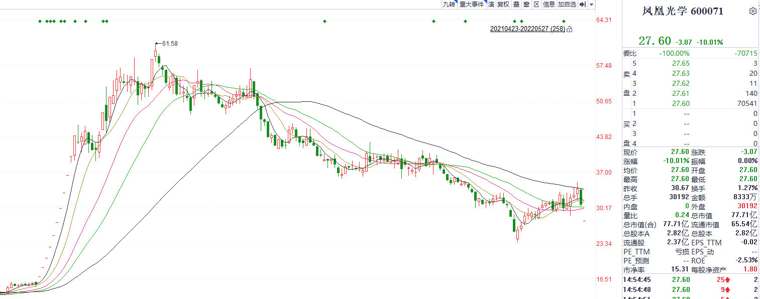 5月27日凤凰光学开盘即一字跌停,截至收盘仍有7.05万手卖单未能出逃。当日盘后公司发布公告称,拟终止重大资产重组事项。而前一日(5月26日)公司股价大跌9.02%。