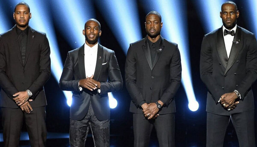 安东尼、詹姆斯、韦德与保罗,四名高大健壮、西装革履的运动员并排站上舞台,使颁奖典礼的开场变得有些严肃。他们呼吁所有运动员运用自己的影响力努力终止暴力。