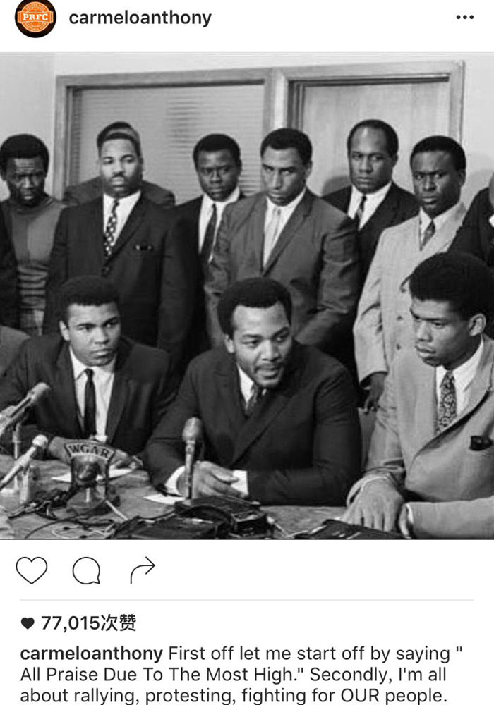 NBA球星卡梅罗·安东尼曾在自己的社交媒体上就暴力事件发表了自己的观点,并配上了一张拳王默罕默德·阿里在1967年峰会上的照片,在那次会议上,阿里在克利夫兰召集了几名全国最有影响力的非裔运动员,讨论了困扰美国民众,尤其是少数群体的一些议题。