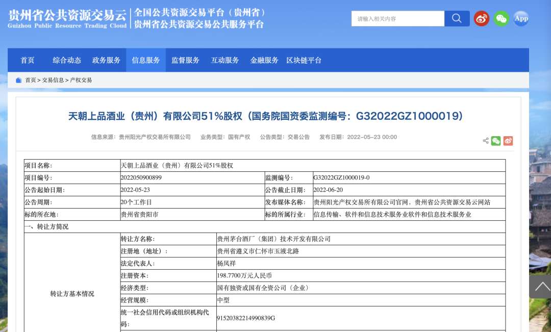 5月23日,贵州阳光产权交易所有限公司官网显示,茅台技开公司拟转让天朝上品酒业51%股权,目前该产权交易处于预披露阶段。一个月前,茅台旗下另一品牌白金酒也同病相怜,被茅台保健酒公司挂牌出售其所持有的40%股权。