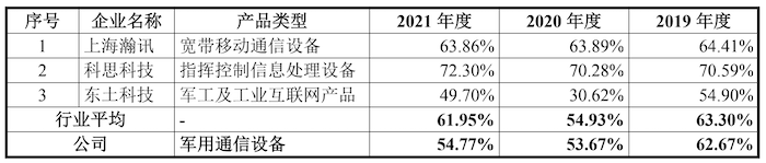 公司选取的上海瀚讯(300762)、科思科技(688788)和东土科技(300353)同行,平均综合毛利率分别为63.30%、54.93%和61.95%。可以看到,2021年公司军用通讯设备54.77%的毛利率已远远不及行业平均值61.95%。