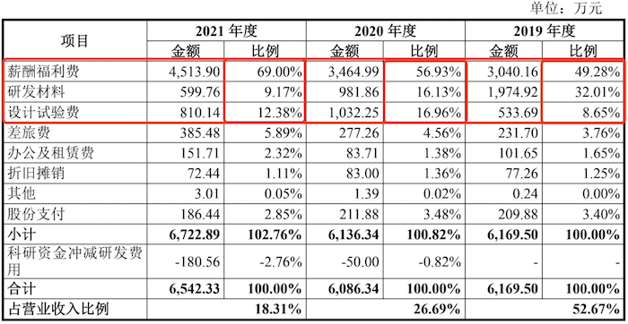 2020年、2021年,研发项目主要以立项论证阶段、方案设计阶段和技术状态鉴定阶段项目为主,研发材料耗用较少。另外,比特技术研发费用中设计实验费占比从2019年的8.65%增至2020年的16.96%并进一步增加至2021年的12.38%。2021年,比特技术设计实验费主要是设计外协费,即委托外协供应商提供的技术服务。