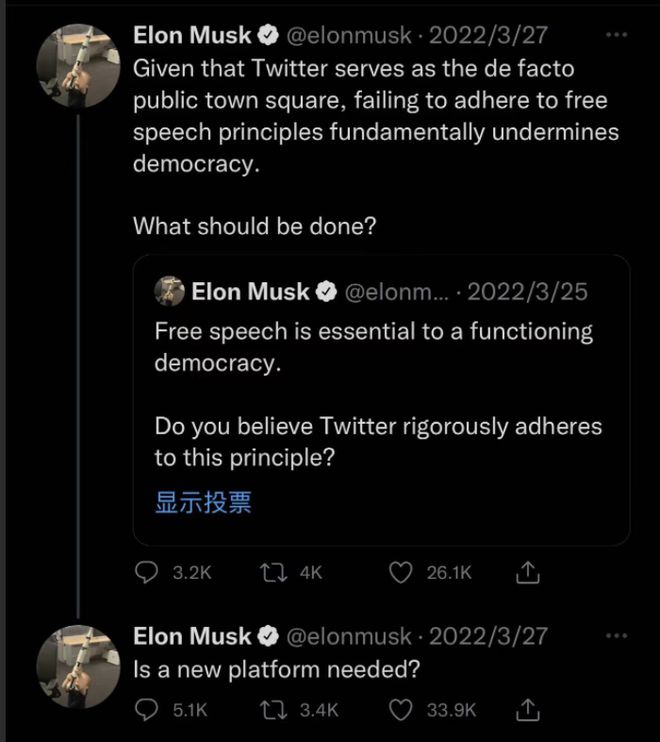 在有超200万人参与并有70%的人认为“Twitter并没有维护自己的言论自由”后,3月27日,马斯克再次以“我们是否需要一个新的平台呢?”收获了超3万的点赞。
