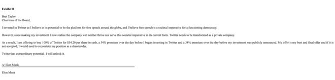 在其只有四段的Twitter收购书上,明明白白表达了三个核心点,即“公司是好公司,但管的人不行,得交给‘我来’”;“我”投资的消息让Twitter股价大涨,并且“我”给出的价格十分厚道以及如果Twitter的私有化不成功,那么“我”就没有信心Twitter能够成为最好的样子。“我”也会对现在所持有的股份重新考虑。