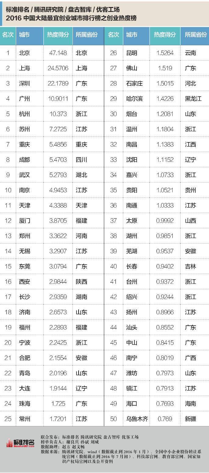 该榜单关于“创业热度”得分一项显示,北京、上海、深圳、广州、杭州、苏州、重庆、成都、武汉、南京位居前十名。“创业热度”的二级指标包括互联网+创新创业指数(上线APP数、有效创业项目数)、新三板挂牌企业量、城市创业融资总额三个方面。