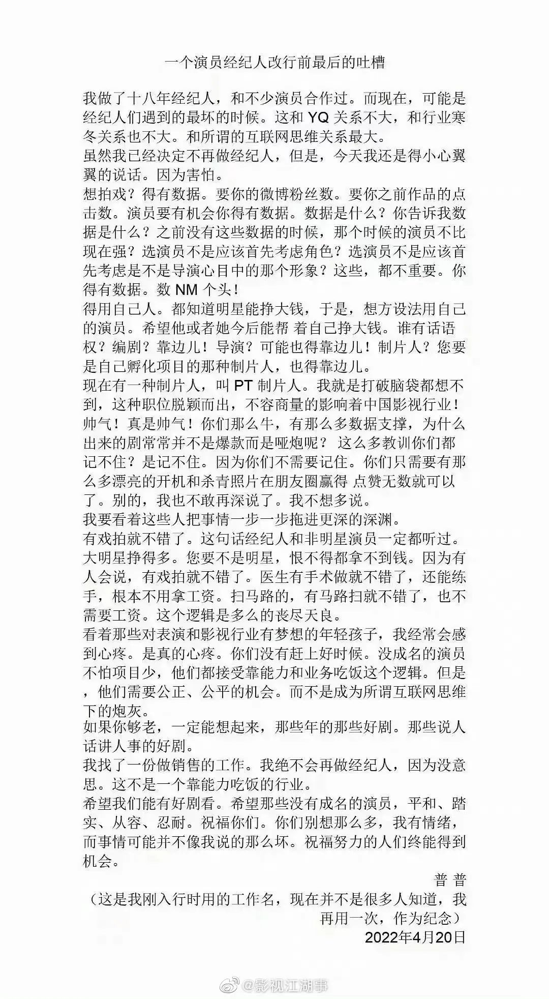然而娱乐圈从好剧频生变成数据、流量为上也不过短短十余年,前不久一封《一个演员经纪人转行前最后的吐槽》在业内流传,控诉数据、流量大行其道,声称“这不是一个靠能力吃饭的行业”。加之近些年明星频频出事爆雷,爆雷后大众最关心背后的资本是谁,资本最关心如何及时止损。娱乐圈中,资本到底扮演了一个什么样的角色?