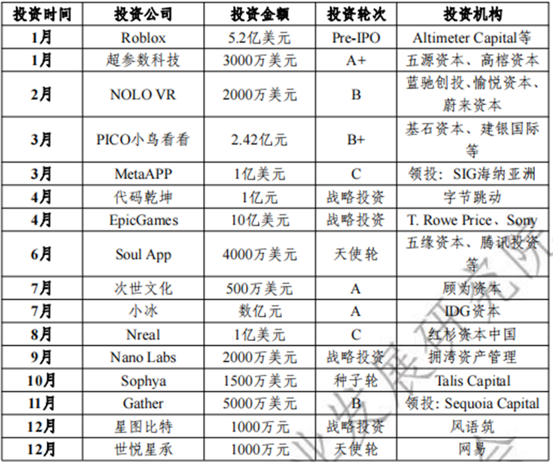 ▲2021年元宇宙领域重点投融资情况