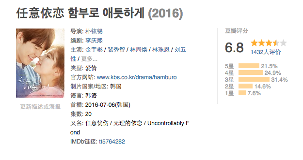 不过,佳绩没能长久,《任意依恋》从第三集开始,收视便难掩颓势。根据韩国尼尔森收视率调查公司15日的统计结果,《任意依恋》第四集的全国收视率为11%,比起上一集的收视率(11.9%)下降了0.9%,三四集的收视率相较首播时的12.5%都有所下滑。在中国,《任意依恋》的豆瓣评分已经一路狂跌至6.8,差评如潮。观众们纷纷表示“隐约闻到了套路的酸臭味”“只有颜能看了”“剧情实在很‘任意’”等等。