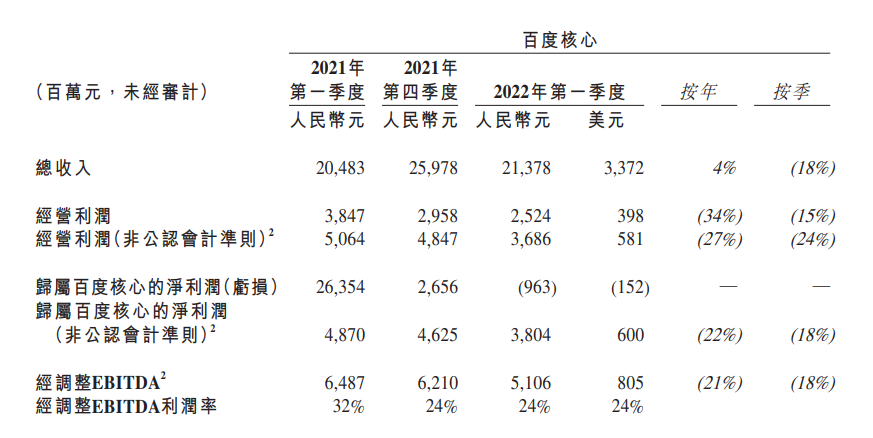 财报显示,截至3月,百度自由现金流仅为11亿元(不含爱奇艺),而2021年底,这一数字为154亿元。