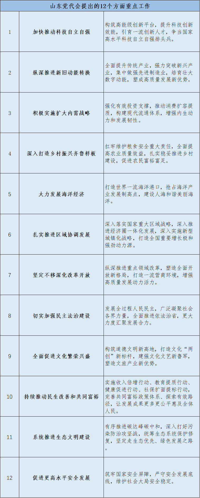 12项重点中,排名前三的分别是:加快推动科技自立自强、纵深推进新旧动能转换、积极实施扩大内需战略。