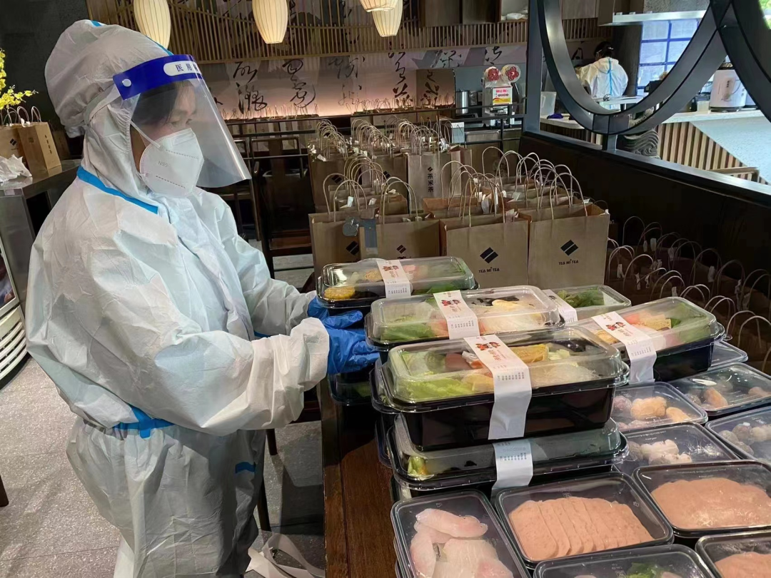 2、人员穿防护服出品,吃住在店里