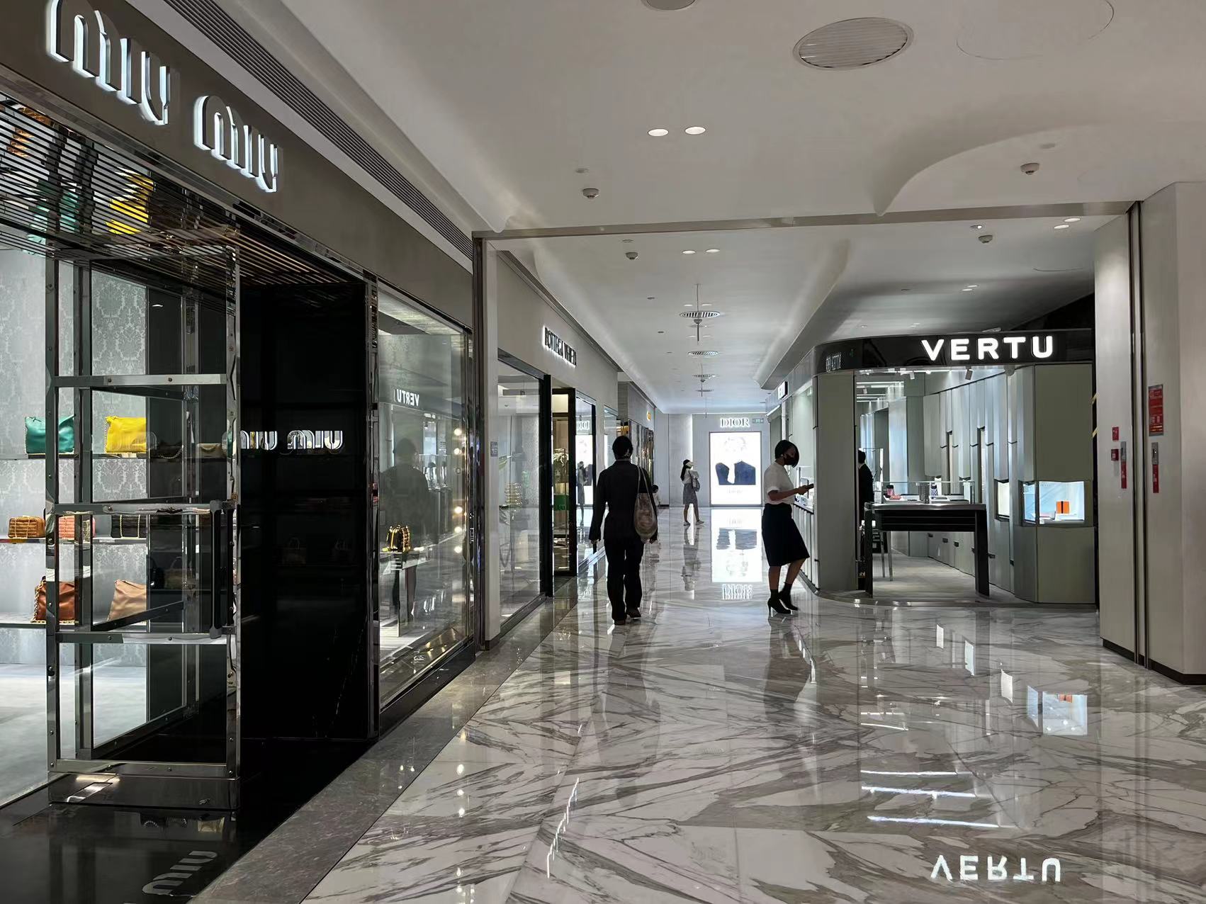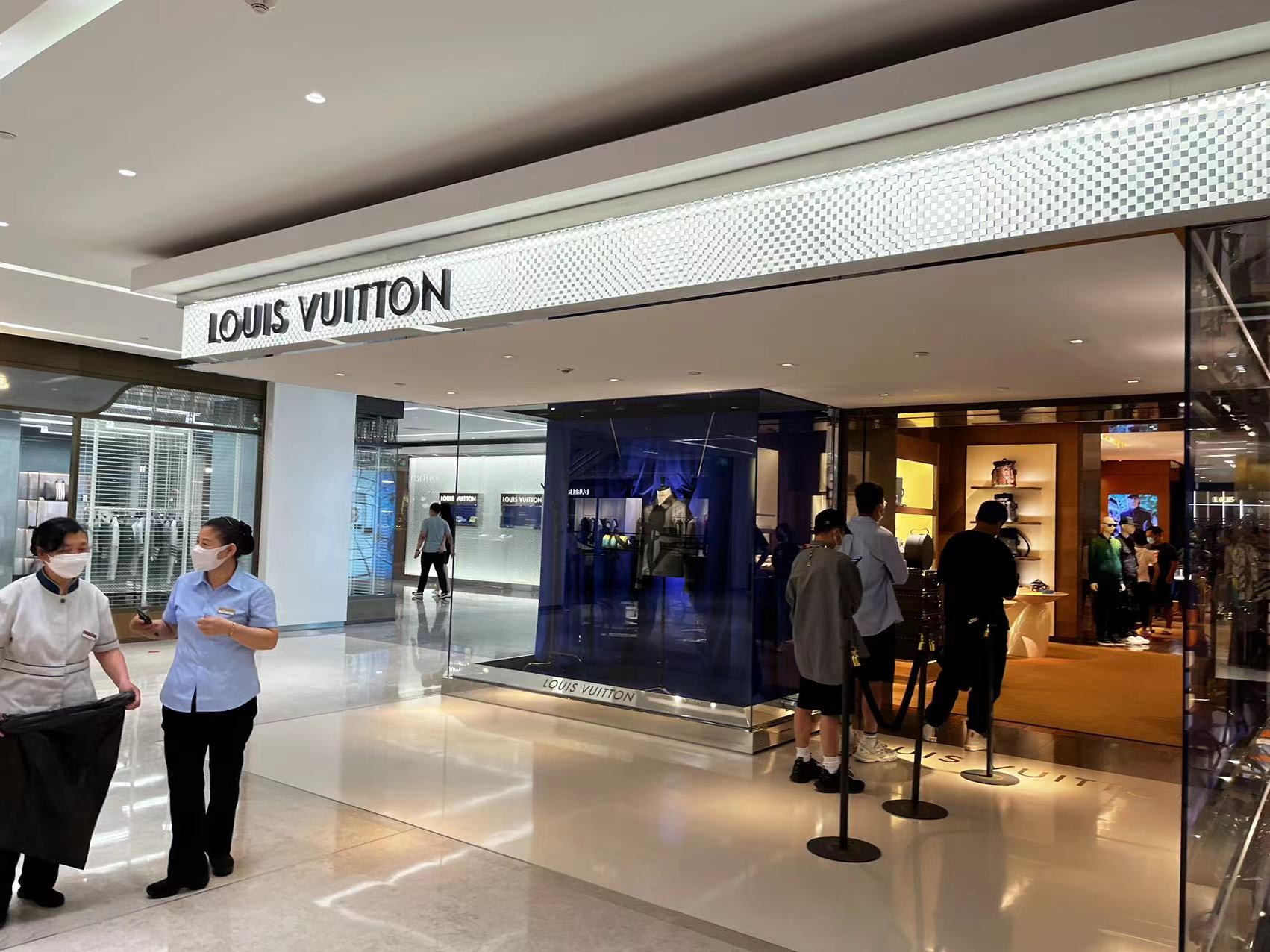 由于是开业首日,商场内部人流较少。但从中午到下午3点这段时间,人流量逐渐增多。路易威登、香奈儿和爱马仕等头部奢侈品牌门店需要排队进入。不过,或出于防疫原因,即使是店内客流较小的品牌,也在门口拉起限流栏。