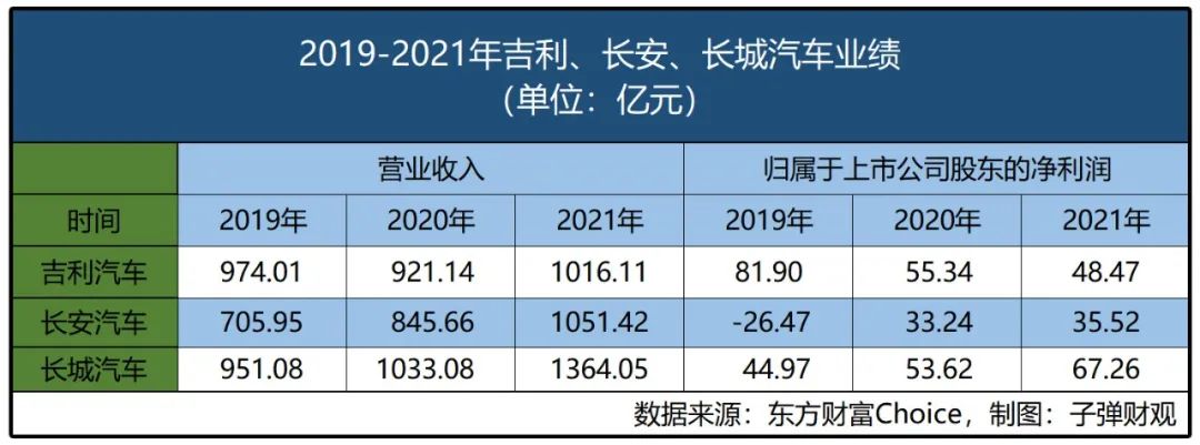 而对比2021年全年财报来看,2021年,长安汽车、长城汽车、吉利汽车归属于上市公司股东的净利润分别为35.52亿元、67.26亿元和48.47亿元,长城汽车在三强中的表现颇为突出。