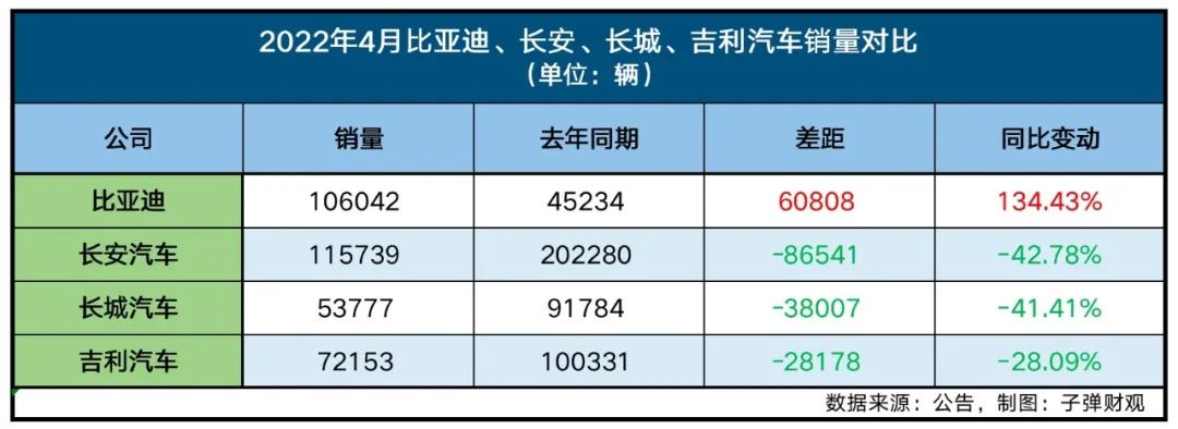 同时,他也表示,“今年比亚迪表现出了很好的增长,但这其中一个原因是比亚迪2021年同期的销量基数相对其它几家比较小,所以它会有比较大的涨幅。就拿今年4月份的销量数据来说,虽然比亚迪销量达到10万辆,同比增长超一倍,但仍然没有同期销量大幅下滑的长安汽车多,也才达到2021年4月时吉利汽车和长城汽车差不多的销量水平。”