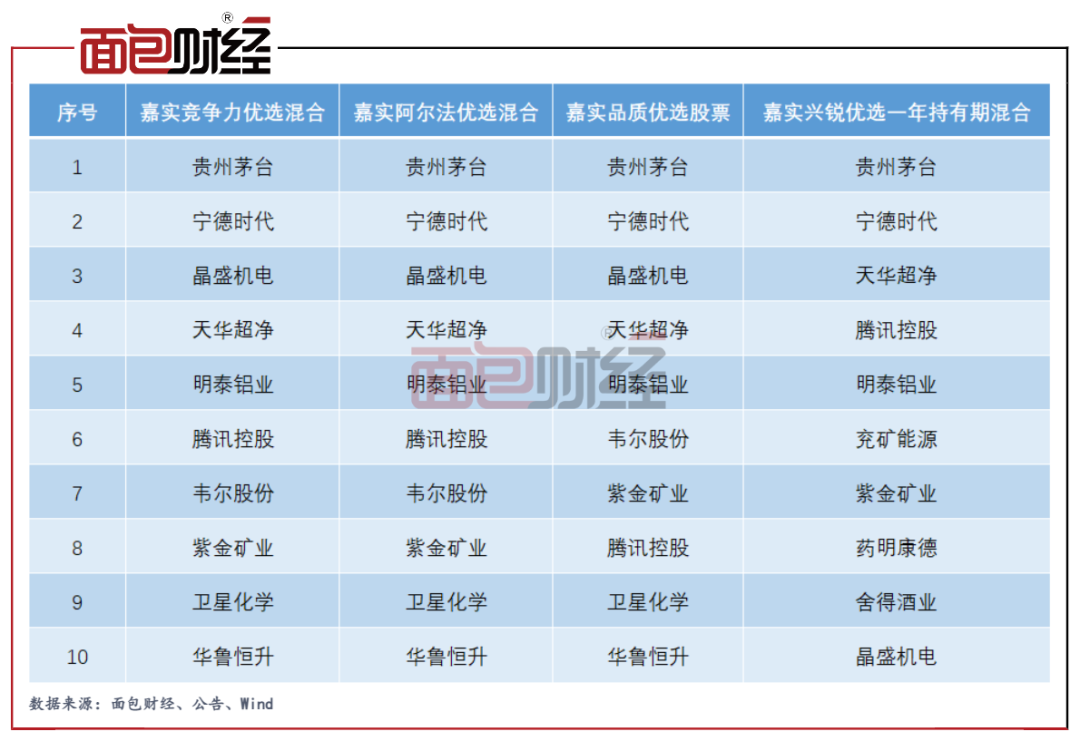 查阅这4只产品2022年一季报的前十大持仓发现,这些基金的持仓高度重合。部分产品如嘉实竞争力优选混合、嘉实阿尔法优选混合连持仓顺序、投资策略也高度雷同。