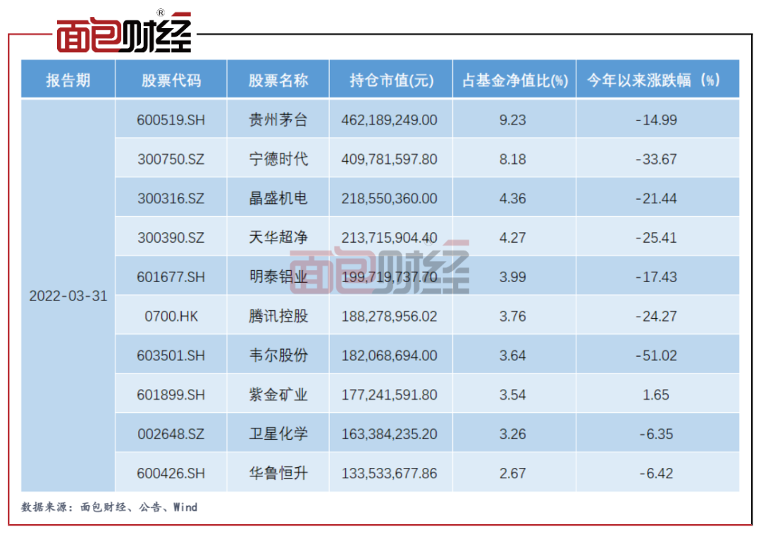 图3:2022年一季度前十大持仓及今年以来涨跌幅