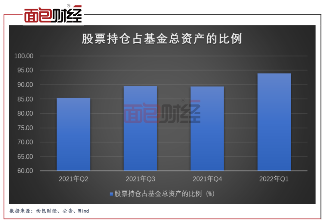 基金成立后披露的首份季报显示,截至2021年二季度末,该基金股票投资金额已达到68.19亿元,占基金总资产的比例为85.42%。随后几个季度,嘉实竞争力优选混合的股票持仓整体处于上升趋势并于2022年一季度末达到近94%。