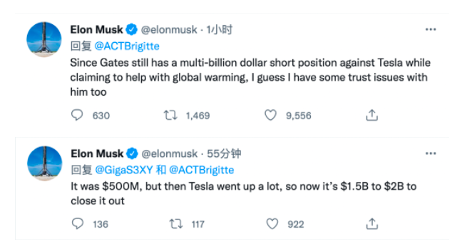 马斯克表示,盖茨一边声称要帮助解决全球变暖问题,一边还“数十亿美元”做空特斯拉,我想我对他有一些信任问题。粉丝询问比尔盖茨的空头头寸如何从“5亿美元”增加到“数十亿美元”,马斯克回应:原来是5亿美元,但后来特斯拉涨了很多,所以现在要花15亿到20亿美元才能了结。