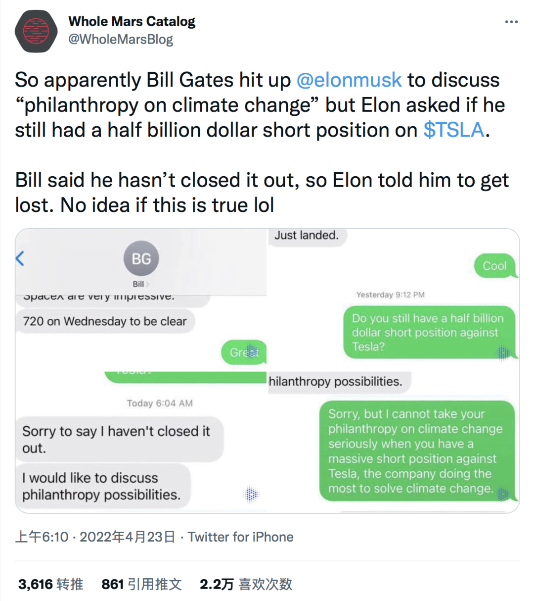 此前,马斯克在推特发文承认曾私下“质问”盖茨是不是做空了特斯拉股票。针对一张网传马斯克和盖茨的短信截屏,马斯克称没有把它泄露给纽约时报,他们一定是通过朋友的朋友得到的。