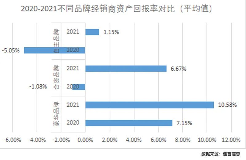 据储吉信息数据显示,2021年,国内豪华品牌经销商平均资产回报率达到10.58%,而合资品牌和自主品牌分别为6.67%和1.15%,换言之,豪华品牌资产回报率是自主品牌的9.2倍,是合资品牌的1.6倍。