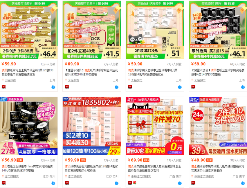 造成这些公司身口不一的直接原因,有相关从业人员表示,纸品价格一般在消费者心中有大概固定的价格,如果涨价幅度较为明显,这些忠诚度较低的消费者将难以接受并转向其他品牌或平替。而且他们还会通过“618”、“双11”等优惠力度大的购物节集中囤货,拉长市场存量消化的时间,最终导致终端提价的速度远远赶不上原材料上涨的力度。