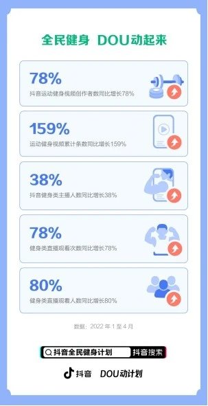根据抖音发布的《抖音运动健身报告》,2022年1至4月,抖音平台运动健身视频创作者数同比增长78%,运动健身视频累计条数同比增长159%;健身类主播人数同比增长38%,健身类直播观看人数同比增长80%。