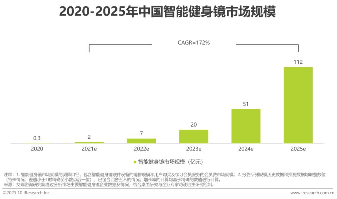 根据艾瑞咨询统计数据,我国智能健身镜2020年的市场规模约为0.3亿元,出货量约为0.4万台。到2025年,该市场规模有望达到112亿元,出货量达到187万台。