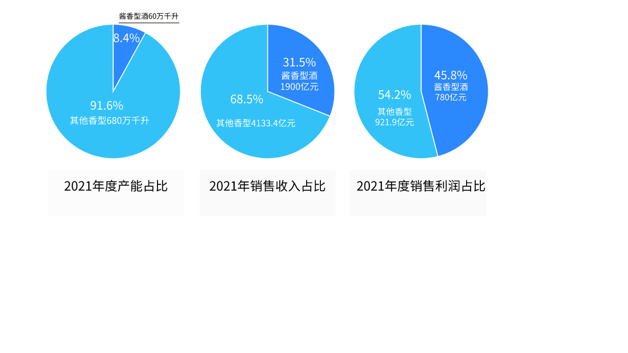 近日,业内知名研究机构权图酱酒工作室发布《2022年度酱酒报告》显示,2021年,中国酱酒产能约60万千升,约占中国白酒产能的715.63万千升的8.4%。但就是这仅仅8%的产能,贡献了1900亿元的销售收入,约占我国白酒行业销售收入6033.48亿元的31.5%;实现利润约780亿元,约占我国白酒行业利润1701.94亿元的45.8%。