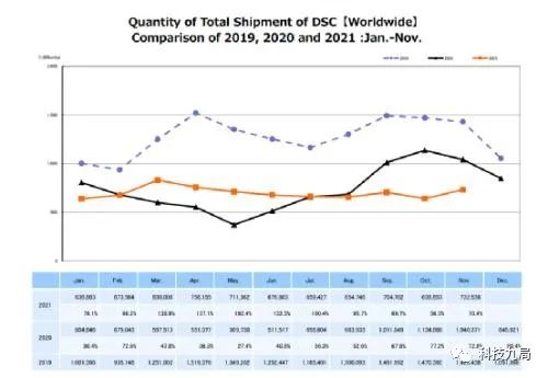2019年以来,全球相机的出货量一路下挫,其中2021年的11月的出货量同比下降了约30%,相较于2019年11月则下降了约48.7%。