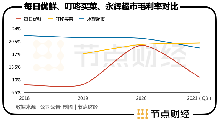 例如永辉超市在社区团购上的老对手叮咚买菜,2021年四季度的毛利率为27.7%,较三季度大幅提升近10个百分点,说明社区团购已经放弃了亏本烧钱,生鲜零售的行业竞争也趋于缓和,盈利或许是业内公司目前的共识。