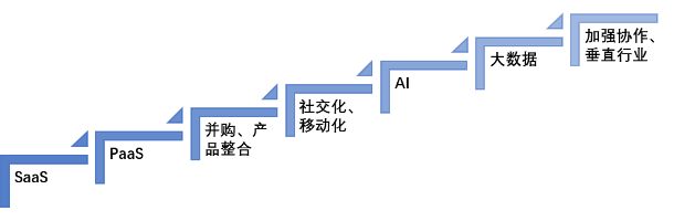 一直以来,Salesforce围绕CRM这一主体不断深化,如果将Salesforce的成长经历比喻成多级跳跃,那么从引入执行SaaS这个概念的时候,它就已经完成了第一级。回顾Salesforce20余年的历史,2010年之前主要是内生发展期,2011年后,Salesforce开启外延并购拓展,由并购及自然渗透双重叠加,让它的CAGR保持在20%-40%的增长,过渡到2015后,增长率保持在20%-30%之间,逐渐趋于成熟。