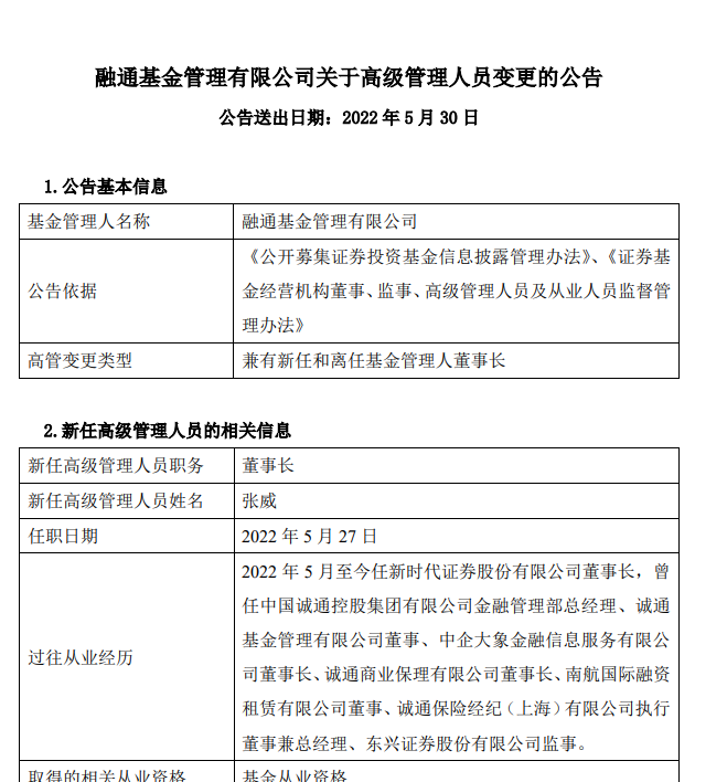 新时代证券结束被接管后的第一个大动作,便是对融通基金的董事长人选进行了变更。今日,融通基金公告,原董事长高峰因个人原因离任董事长,新任张威为公司董事长,任职日期为5月27日。