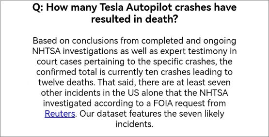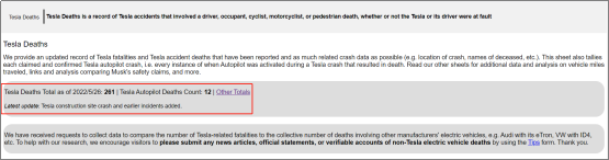 美国公路安全保险协会(IIHS)数据显示,截至2022年5月26日,涉及特斯拉事故的死亡总数达到261人,其中特斯拉Autopilot事故10起,死亡12人。