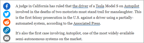 而就在此前2天,美国国家公路交通安全管理局(NHTSA)通报了一起特斯拉车祸致三人死亡的案件,表示其或与特斯拉自动驾驶系统有关。