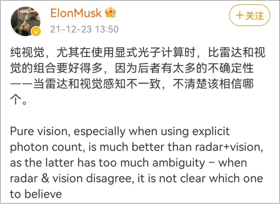 马斯克是旗帜鲜明地反对昂贵的激光雷达方案,认为“只有傻瓜才会用”。所以,特斯拉FSD选择了纯视觉感知路线,以机器视觉为核心,利用毫米波雷达+摄像头解决方案实现自动驾驶。
