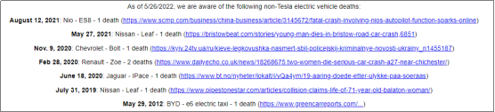 当然,新能源汽车事故不只是发生在特斯拉。包括蔚来、Nissan、雪佛兰、雷诺、捷豹、比亚迪等新能源汽车,都发生过事故致人死亡事件。其中2021年蔚来事故,也有报道车主驾驶时启用自动驾驶功能(NOP领航状态)。
