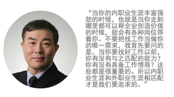 “当你的内职业生涯非常丰富强劲的时候,也就是当你走到哪里都可以帮企业创造价值的时候,就会有各种岗位等着你。不要把找工作当做你的唯一需求,我首先要问的是,当你要找好工作以前,你有没有与之匹配的能力?你有没有具备工作情商?这些都是很重要的。所以内职业生涯和外职业生涯的匹配才是我们要追求的。”