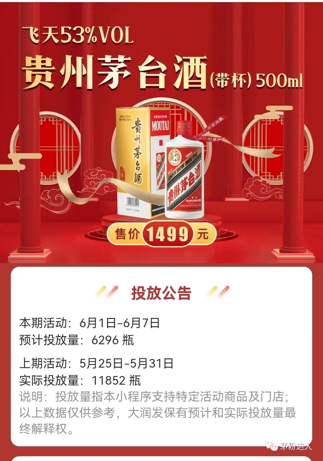除此之外,尽管没有声明与618有关,“i茅台”APP也在5月29日开启了第二场“小茅好运”抢购活动,符合抢购条件用户约81万人次,预计投放20799瓶产品,包含53度500ml飞天茅台、虎茅(单/双瓶装)、珍品茅台酒4款产品。
