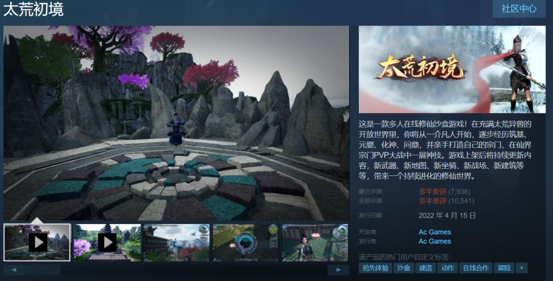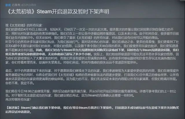 除此之外,4月中旬刚在steam上线EA版本的人气修仙游戏《太荒初境》,也在上线仅六天后就因为服务器问题在steam收获了“多半差评”的评价,不得不宣布暂时紧急下架并接受无条件退款,直至5月初才开始恢复上架购买。