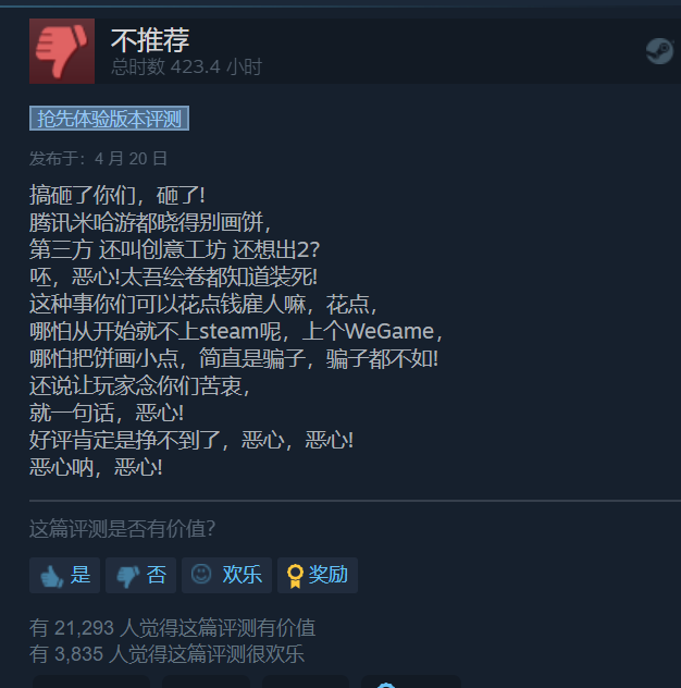 而玩家在这样的集中冲击下,随着情绪的爆发,对于国产EA游戏的态度,也愈加保守化。自己花了钱,并没有得来更多更好的游戏内容体验,连自产内容的权利,也并不能得到保障,这让玩家对未完成没有保障的EA游戏愈加感到恐慌。