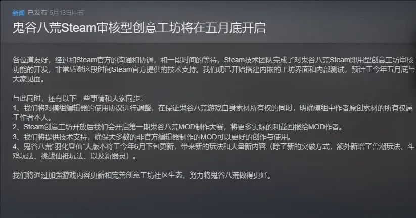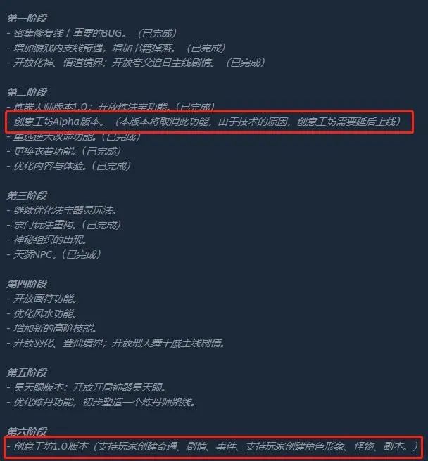 在这样的情况下,《太吾绘卷》、《鬼谷八荒》等游戏其EA模式仍在继续,更新速度却不能满足玩家的需求,玩家对于新内容的需求抱怨已久。在本身内容更新缓慢,更新时间一推再推的情况下,《鬼谷八荒》对玩家曾许诺的开放“创意工坊”,成为了不少玩家心心念念的续命药。