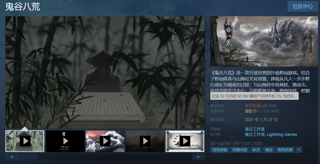 尤其是近些日子焦点的《鬼谷八荒》,在经历了创意工坊事件后,从4月18日至5月18日,其steam上共收到了5.6万篇玩家评价,其中将近5.5万个都是差评,好评率仅有2%,一举击败了《三国杀》成为了Steam上差评率第一的国产游戏。