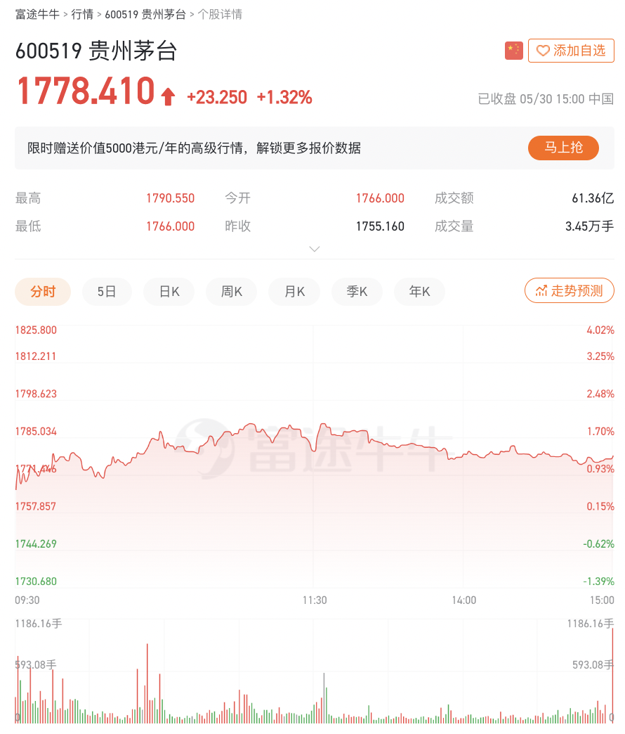 5月30日,贵州茅台报收1778.41元,上涨1.32%。