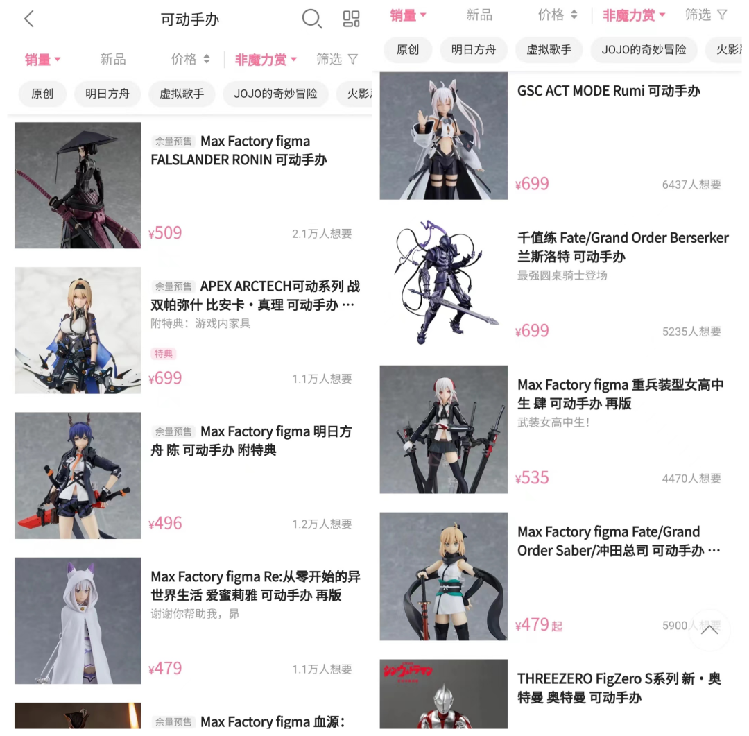 比如在B站“会员购”平台的“可动手办”分类下,排在前列的产品主要来自Max Factory、GSC、万代S.H.Figuarts、Medicos等国际品牌。